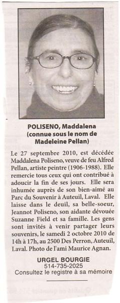 Le décès d'une de ses amies de longues dates, madame Madeleine Pellan, veuve de feu Alfred Pellan. Nous offrons nos sincères condoléances à la famille de cette grande dame qui a oeuvré durant de très longues années dans le domaine des arts visuels. Pour en savoir davantage sur sa contribution.