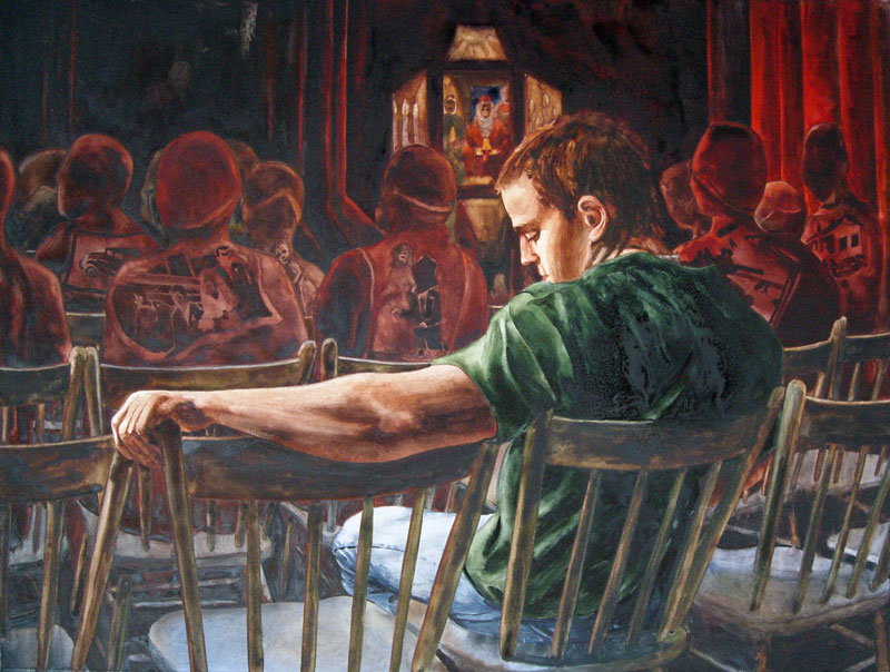 « Ce tableau évoque le fait que nous sommes en quelque sorte prisonniers de notre destin. Il est représenté par mon modèle préféré, mon fils Mathieu, (méditatif), assis sur une chaise à barreaux, ce qui n'est pas coutumier dans nos églises, réfléchissant la couleur du ciel. Il est vêtu d'un chandail vert et de jeans bleu qui représentent l'espoir, la vie, la jeunesse, la continuité, l'infini, la renaissance, l'eau, l'horizon, etc.? Il est le personnage vivant, en opposition avec la mort, que j'ai choisi de représenter par la couleur rouge symbole qu'on identifie facilement dans notre vie quotidienne comme l'arrêt obligatoire pour toute croyance. C'est un choix que j'ai fait en sachant bien que, dans la religion catholique, le violet représente la couleur du décès et de la mort. J'ai choisi le rouge parce que cette couleur s'apparente au principe même de la vie. Je voulais que ce tableau se dissocie des croyances. J'ai délibérément composé le vitrail ornant ce sanctuaire d'une célébration eucharistique sur le deuil et qui représente la religion de ma naissance. Je voulais un endroit vide de tous symboles religieux connus, parce que pour moi toutes les âmes dans la mort sont toutes aussi importantes les unes que les autres quelles que soient leurs croyances ou religions. Ce lieu n'est décoré que des colonnes avec angles élevant les âmes vers le céleste. Et tous ses gens, personnages, acteurs de ce tableau, dont les vies, ce sont probablement arrêtées ou bien fantômes de ses lieux apportent tous avec eux, leurs âmes, leurs bagages de souvenirs, que j'ai représenté avec une projection d'images de leur vie passée sur leur corps nu et sans identité personnelle. Tantôt la naissance, le mariage, la séparation, la guerre (pour la mort), la maison (pour la famille), le bébé (pour les premier pas, l'avenir, etc.), la première voiture (pour tout les chemins qu'emprunte la vie)?.. Toutes ses images évoquées de cette façon, sont aussi, le seul et vrai héritage qui demeure acquis dans les mémoires de tous ceux et celles qui subsistent, et qui sont en réflexion (deuil).